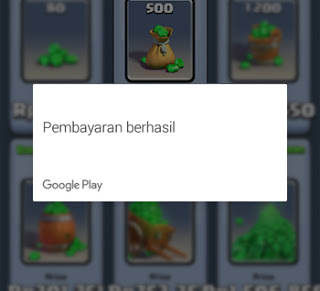 3. Pilih dan tap gems yang harganya sesuai dengan saldo google play sobat kemudian tap Beli lalu masukan sandi gmail sobat dan klik Konfirmasi maka akan ada notifikasi seperti gambar dibawah yang artinya gems sudah diterima.